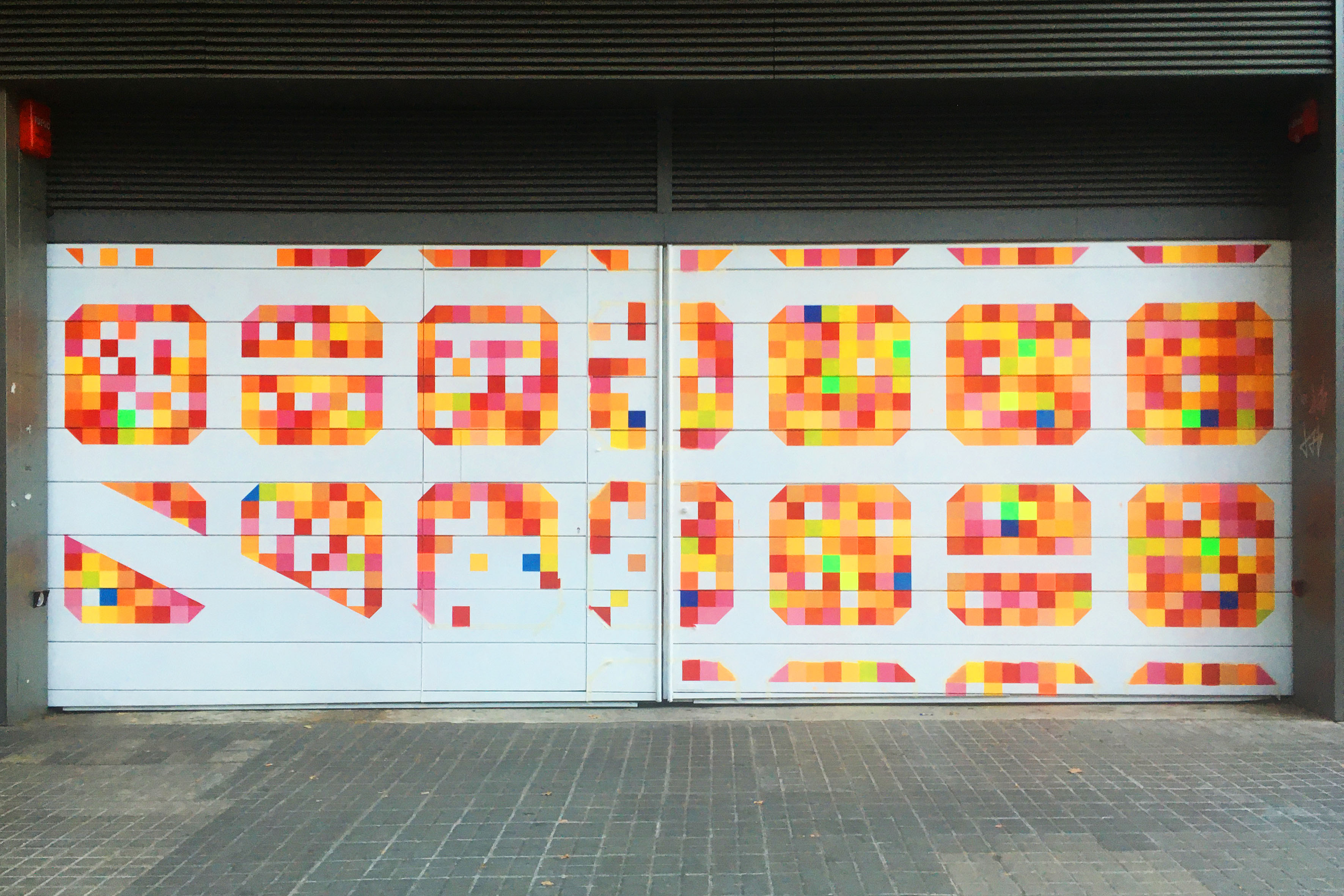 ‘Eixample’ is a 7x3m spray-painted mural on the entrance doors to a car park located in the middle of the urban fabric of the city of Barcelona, l’Eixample. From small pieces of 10×10 cm, a mesh similar to a cartographic representation of the environment in which it is located is filled. The hue of the mural is identified with the ceramic roofs of the buildings, a material with orange tones, so typical of Mediterranean towns.