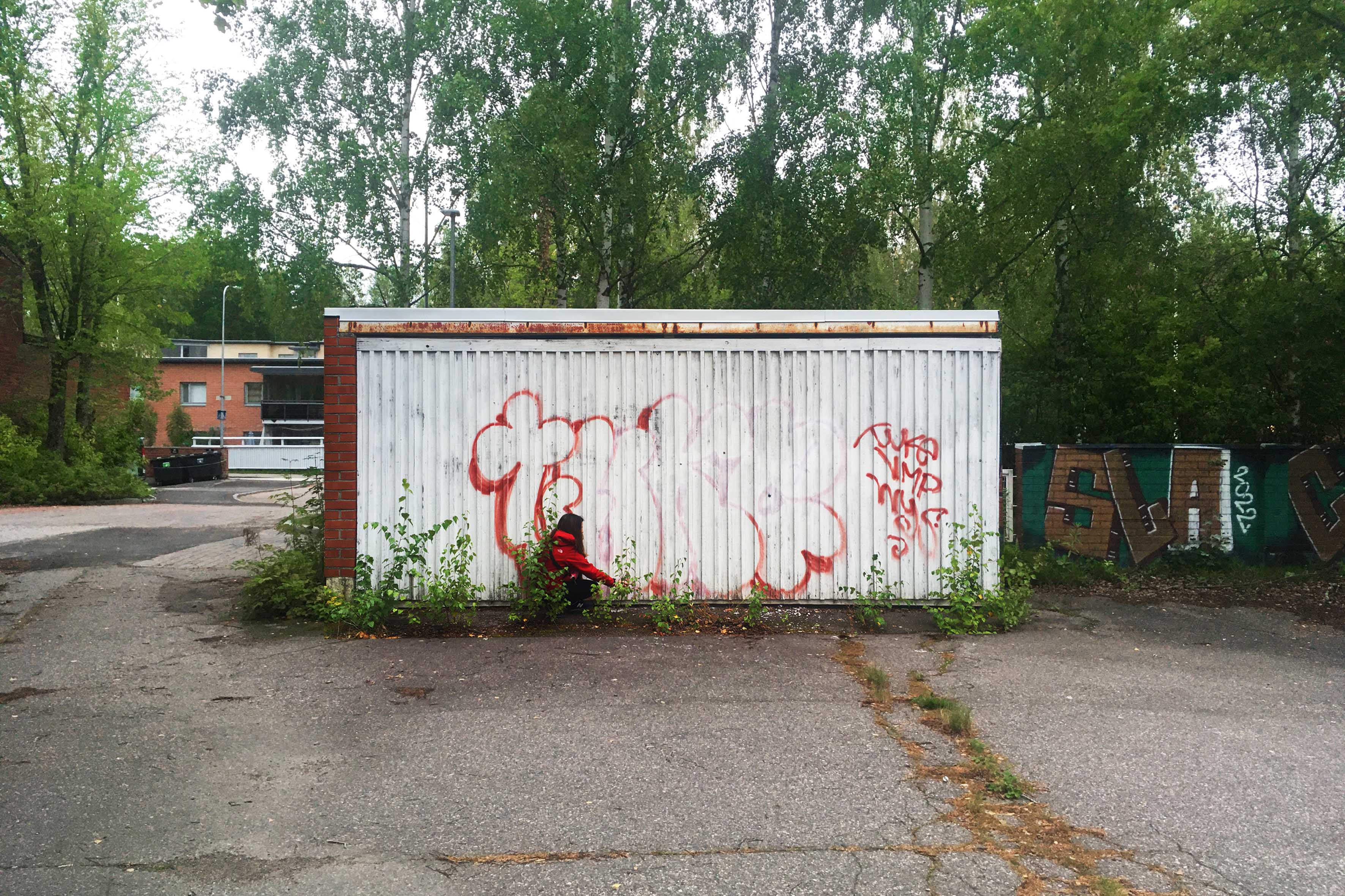 ‘Ruïnes III’ (‘ruins’ in catalan language) is a 5×2,5m spray-painted mural in a residential neighborhood of Malminkartano, on the outskirts of Helsinki (Finland). Abstract and minimalist in nature, it uses a single color to trace alternating vertical stripes, which make visible the dimension and isolation of the volume of an abandoned storage room in the middle of the landscape. The wooden support, with vertical slats and painted white, acquires depth, texture, and contrast.