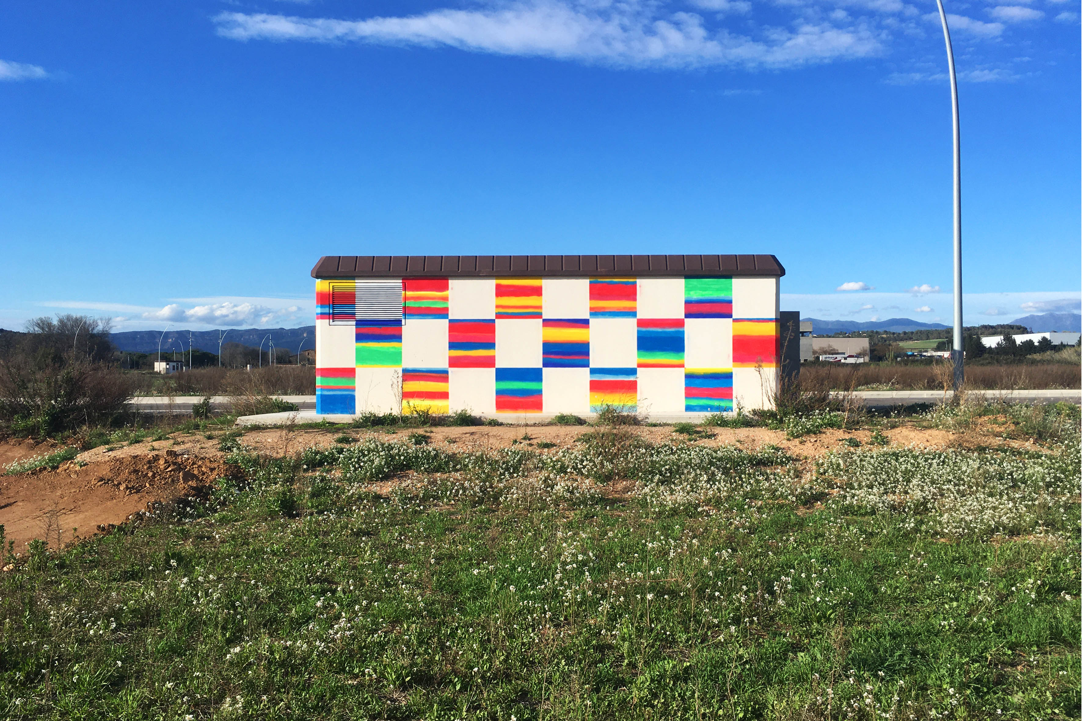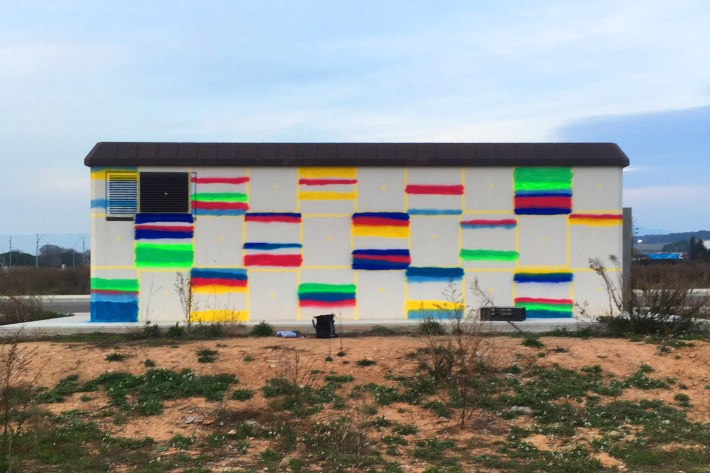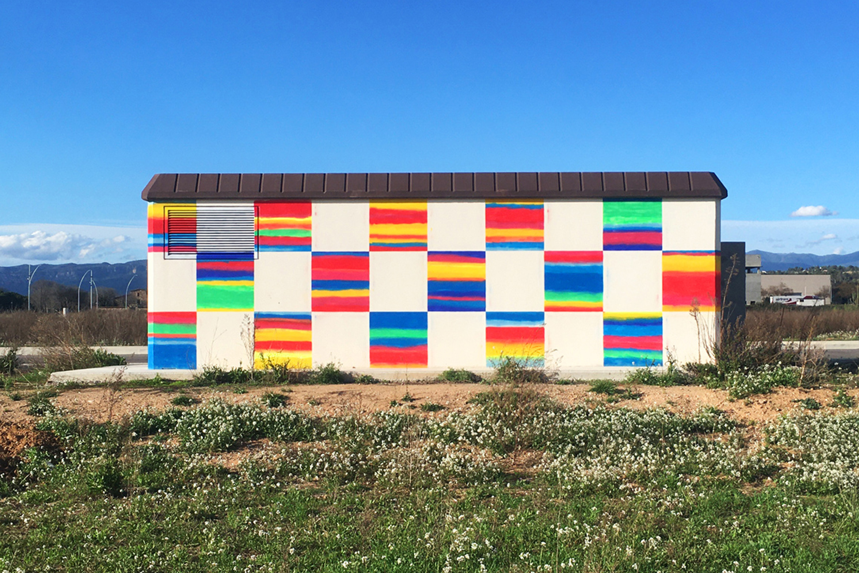 ‘Ruïnes’ (‘Ruins’ in catalan language) is a 8x3m mural, painted on a new-building element located in an industrial zone, where there used to be fields. Abstract and minimalist in nature, it uses strips of color made with an organic layout, which make visible the isolation of the wall in the middle of the landscape and return it to the living spirit of a blooming spring landscape.