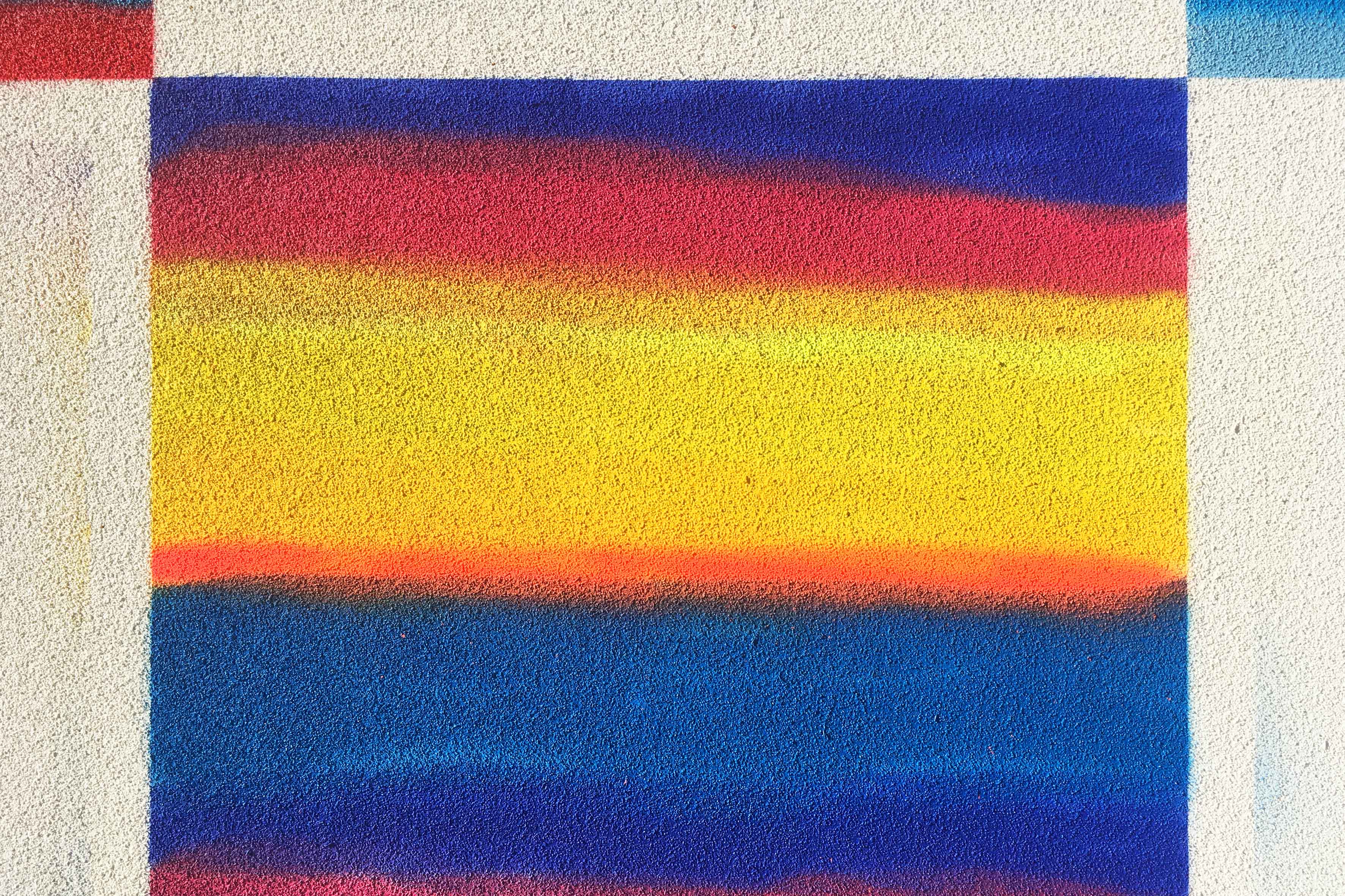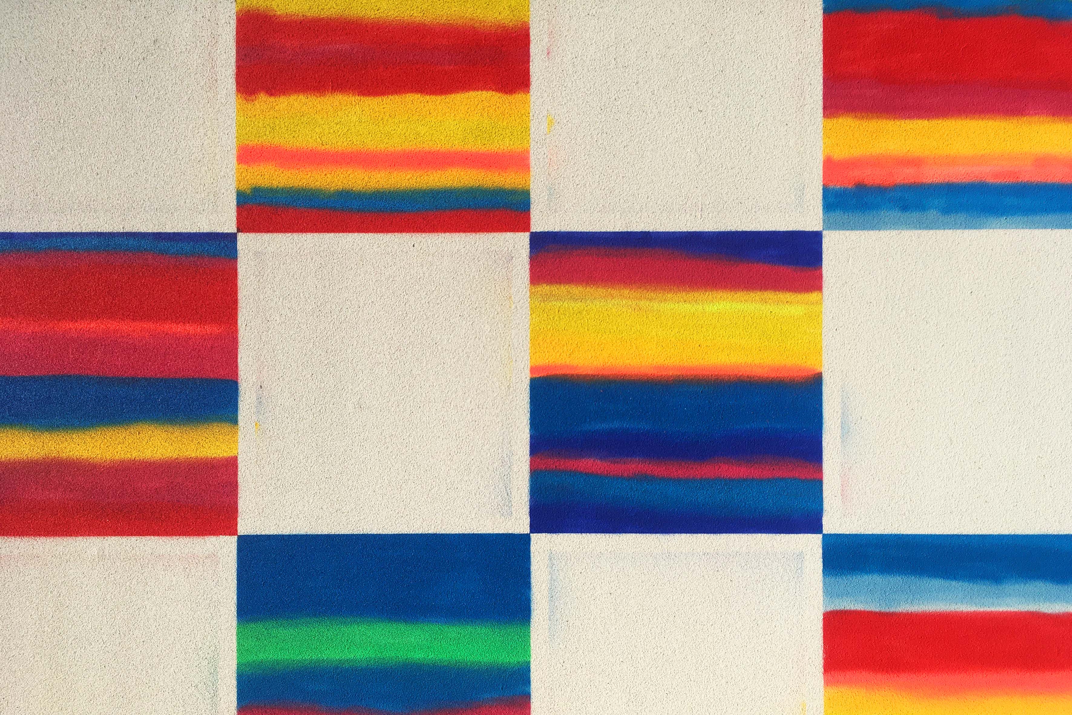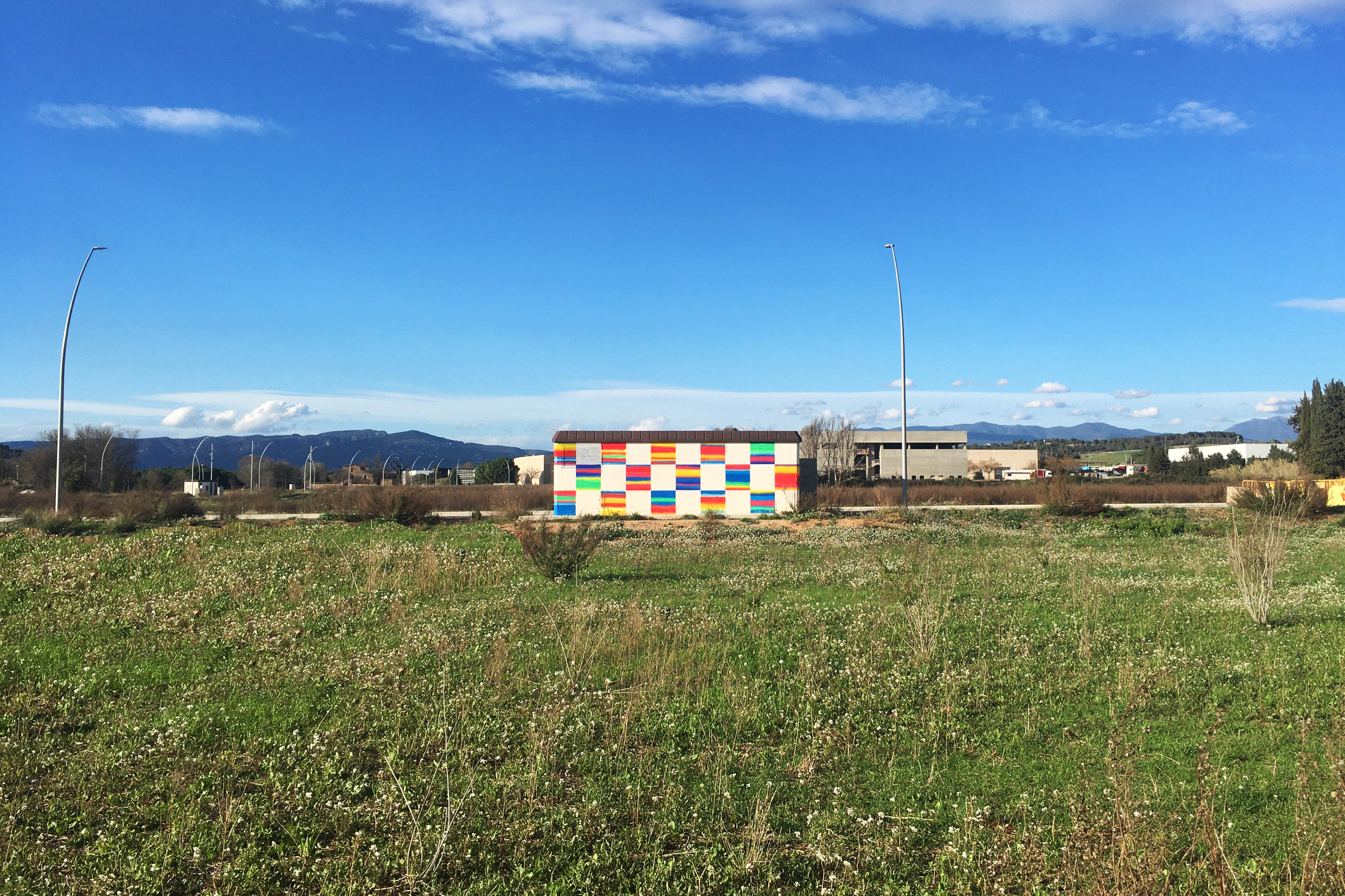 ‘Ruïnes’ (‘Ruins’ in catalan language) is a 8x3m mural, painted on a new-building element located in an industrial zone, where there used to be fields. Abstract and minimalist in nature, it uses strips of color made with an organic layout, which make visible the isolation of the wall in the middle of the landscape and return it to the living spirit of a blooming spring landscape.