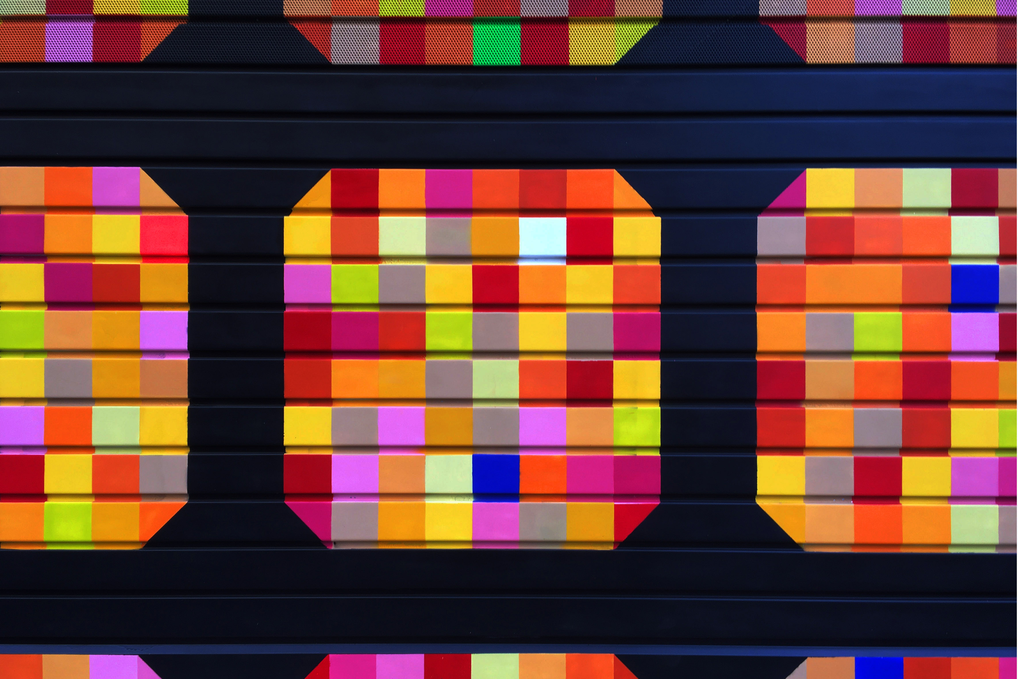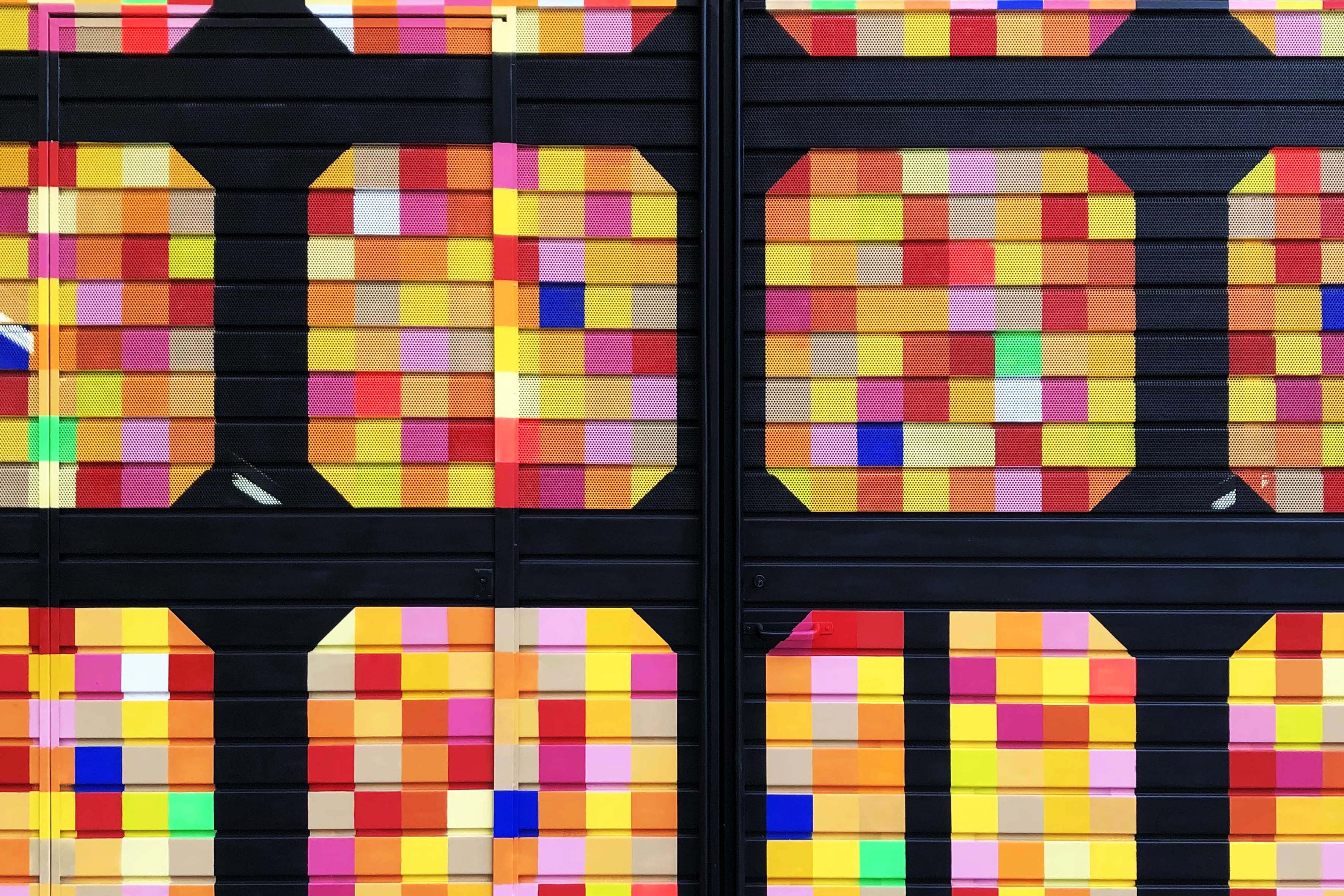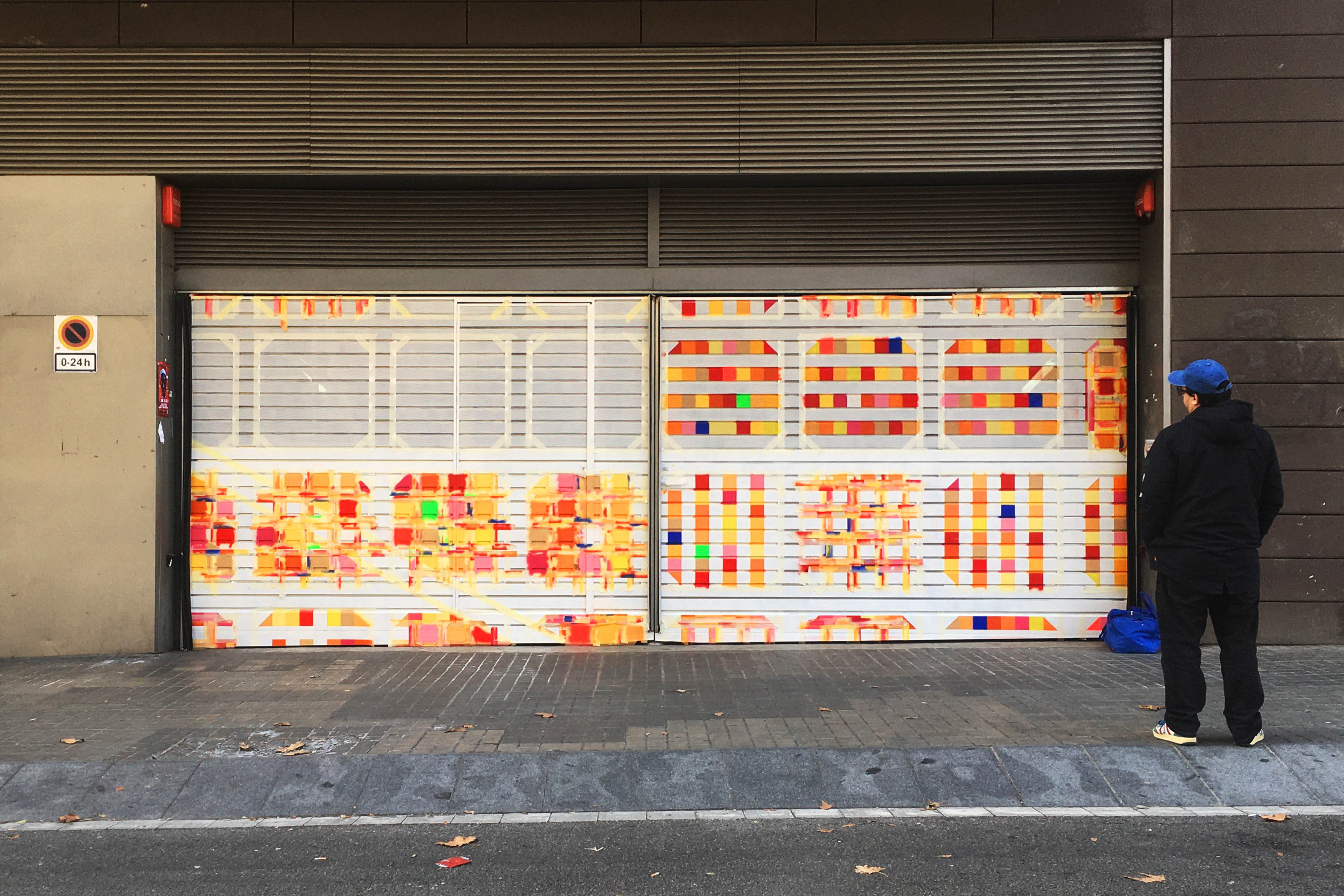 ‘Eixample IV’ is a remake of a 7x3m spray-painted mural on the entrance doors to a car park located in the middle of the urban fabric of the city of Barcelona, l’Eixample. From small pieces of 10×10 cm, a mesh similar to a cartographic representation of the environment in which it is located is filled. The hue of the mural is identified with the ceramic roofs of the buildings, a material with orange tones, so typical of Mediterranean towns.