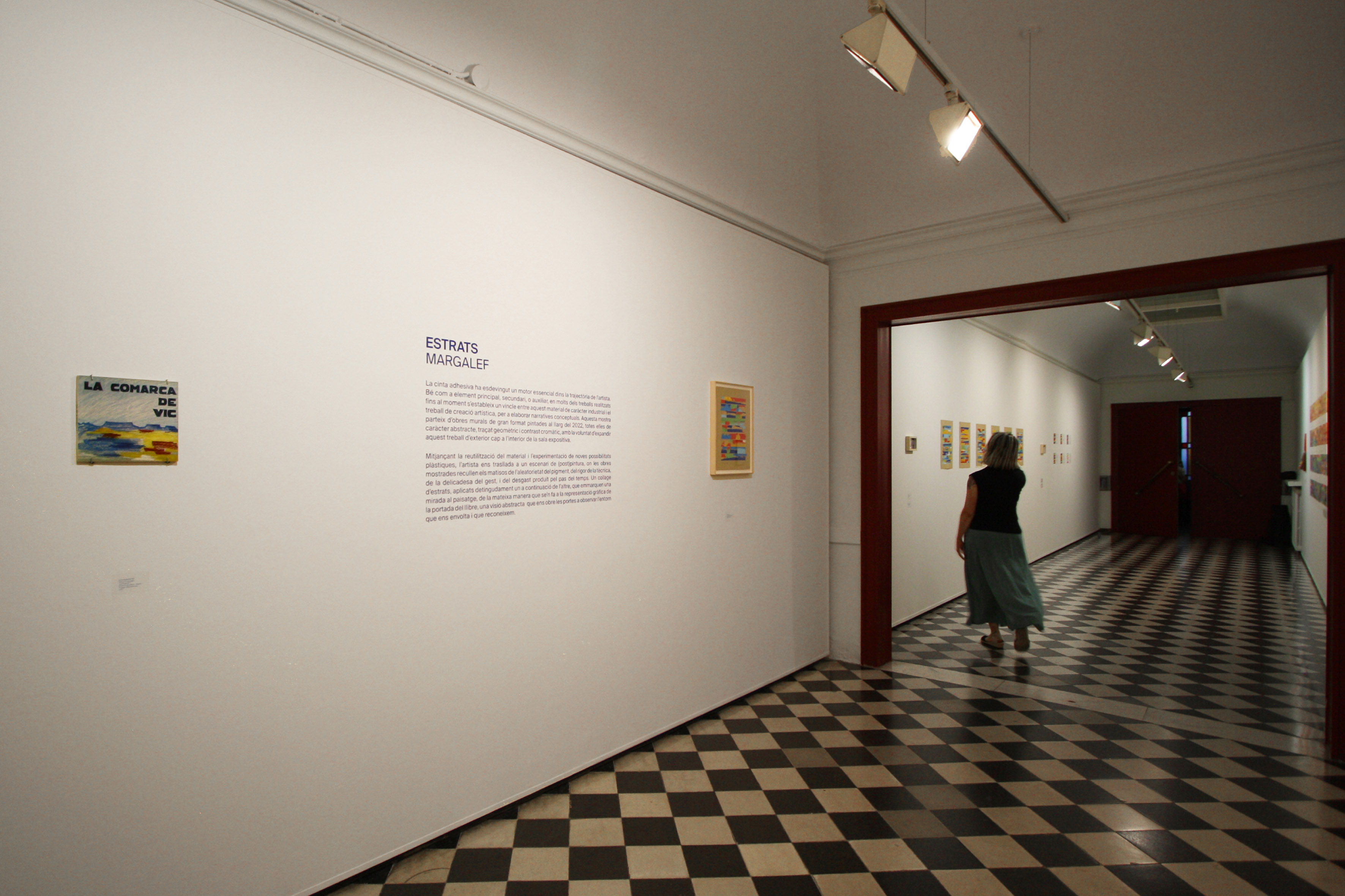 ‘Estrats’ és el títol d’una mostra individual que té lloc a l’espai expositiu del Casino de Vic del 13.06.25 al 20.09.25, a la ciutat de Vic, on es mostra un procés creatiu de l’artista a partir de treballs anteriors i noves creacions recents basades en l’experimentació amb cinta adhesiva de paper reutilitzada. Una exercici de (post)pintura, on es recullen els matisos de l’aleatorietat del pigment, del rigor de la tècnica, de la delicadesa del gest, i del desgast produït pel pas del temps.